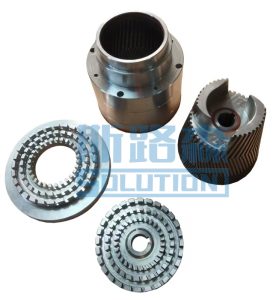 三级齿式研磨盘,配合精密的三级及以上定子转子咬合结构。研磨盘表面有三个及以上沟槽,每个沟槽的刀齿数、方向、宽度、深度不同,剪切研磨能力层层递增。同时配以管线式的三层及以上定转子咬合结构,产生强大的剪切研磨力,线速度更大,流体速度更快,研磨、分散,均质乳化效果更佳。